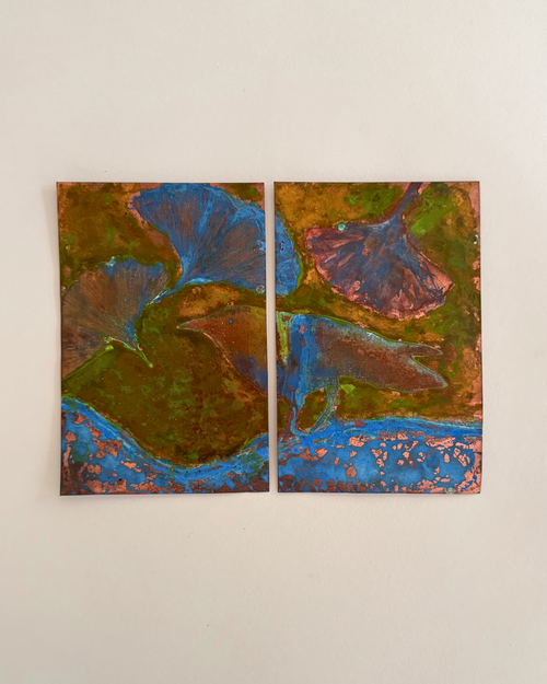 Sewanee, TN artist and naturalist G. Sanford McGee finds and creates beauty using elements from his natural surroundings. Beginning with sheets of copper, plant materials and botanicals that he has collected, McGee applies a series of washes over the copper; which allows the materials to etch and patina with time. The markings left behind vary by combination of color with the different chemical compositions reacting with the copper, some of them red, yellow, blue, green. The process can take place during an entire season or year, all the while taking away and adding to the surfaces.